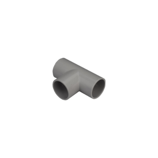 A 25mm PVC straight tee fitting for branching electrical conduit systems. Allows a conduit run to split in two directions from a single point.
